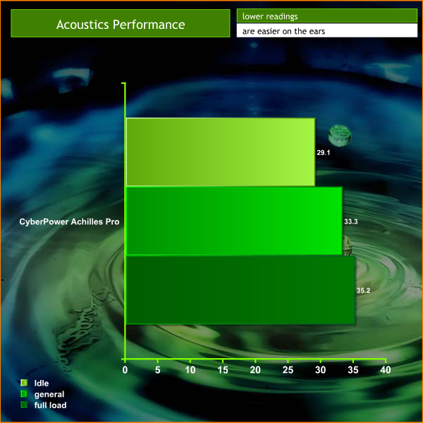 The CyberPower Achilles Pro is a very quiet system, generally not audible at all in a ‘normal' environment. Under heavy load the fans do speed up a little, however it is still a very quiet system and ideal for a living room environment – for instance connected to a high definition television.