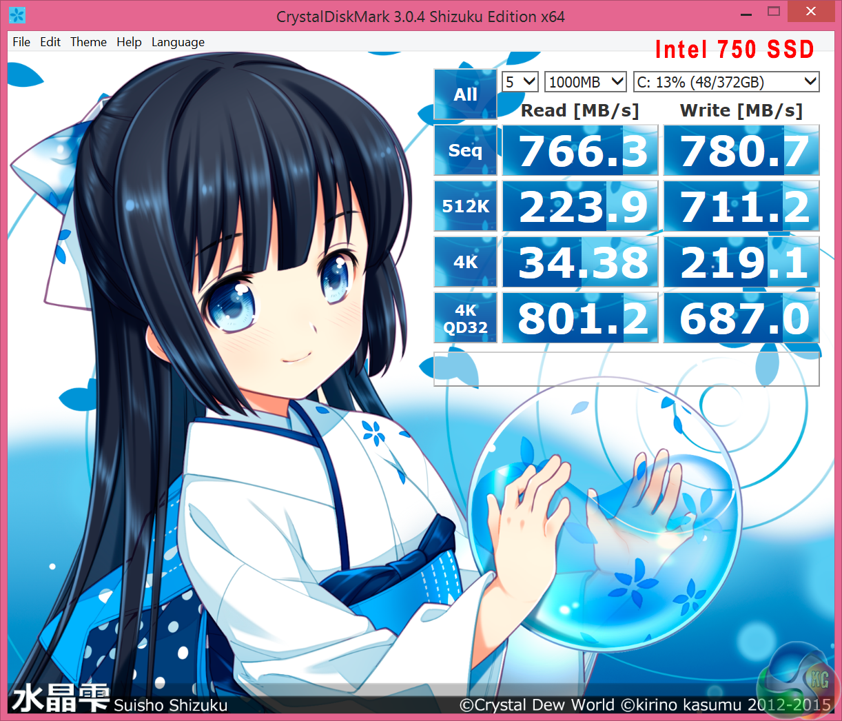 Crystalmark is a useful benchmark to measure theoretical performance levels of hard drives and SSD’s. We are using V3.0.3. We test the Intel 750 drive and the mechanical Raid 0 configuration.
