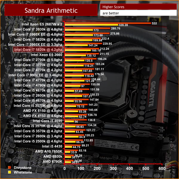 The Core i7 5820k is a powerful processor, especially when overclocked. Quad Channel DDR4 memory performance is also excellent, scoring close to the top of the chart.