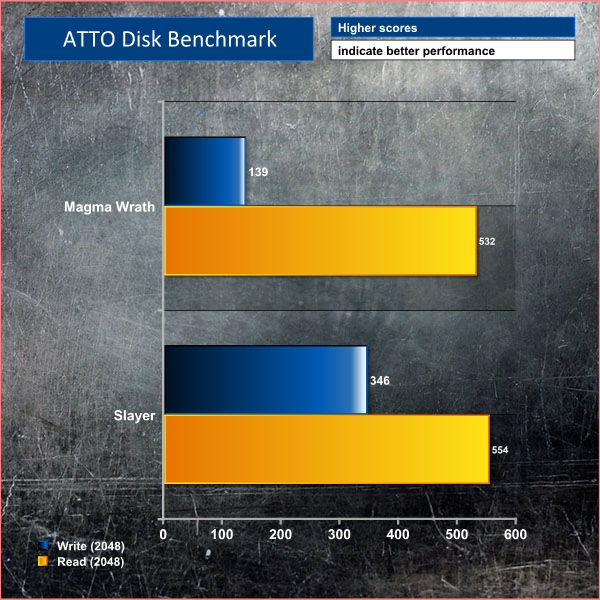 Both systems use Crucial Solid State drives and while read performance is fairly closely matched, we can see write performance favours the MX100 in the Slayer laptop.