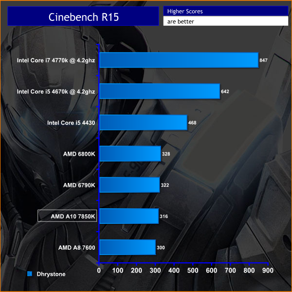 The 4ghz A10 7850K scores 316 points, putting it just behind the last generation 6790K.