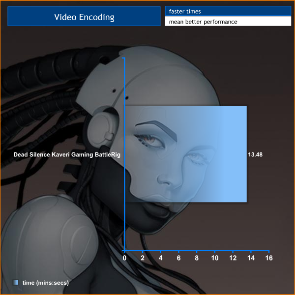The Dead Silence Kaveri Gaming Battlerig completes the test in 13 minutes and 48 seconds. The fastest Core i7 systems will complete this same test in around 7 minutes. The slowest Intel Atom systems will take around 1 hour and 15 minutes.