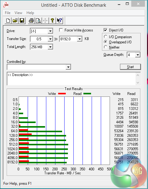 Peaks around 270 MB/s in the read test, close to the performance in CrystalDiskMark.