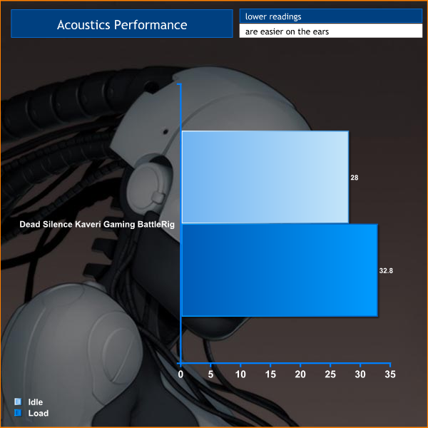 This is an incredibly quiet system, barely measuring on our meter at all. At idle it is basically ‘silent', and when the CPU fan spins up, it peaks just under 33 dBa. This makes it ideal for a living room or bedroom environment.
