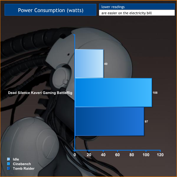 We measure the system power consumption at the wall – not factoring in the monitor. We test when idle – then when loading with Cinebench R15 and Tomb Raider 2014.