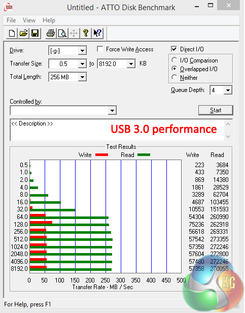 ATTO performance figures aren't quite as high as Crystaldisk, hitting a peak of 270 MB/s read and 60 MB/s write.