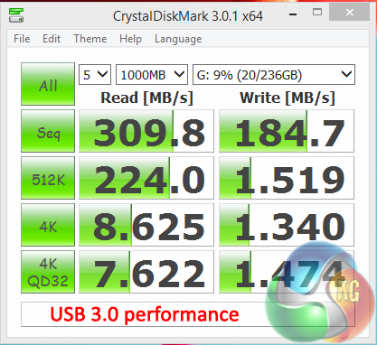 The Gigabyte GA-H81M-S2PV USB 3.0 ports deliver good performance, almost 310 MB/s in the sequential read test.