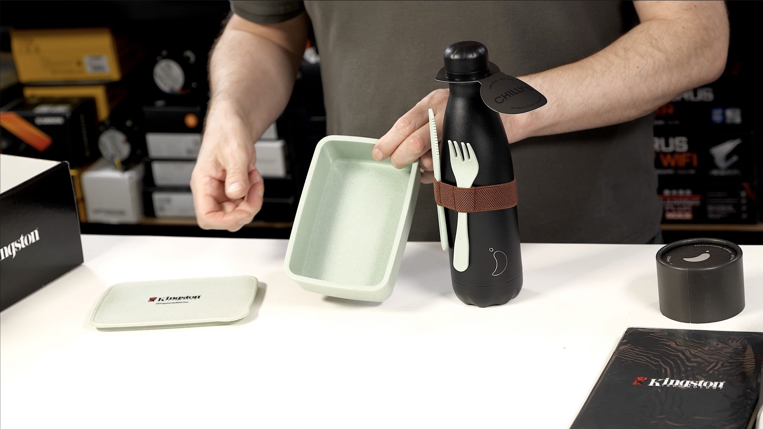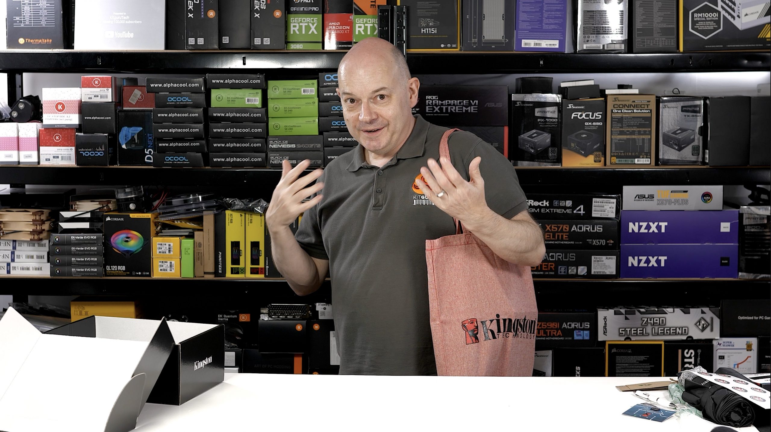 Kingston recently announced a new line up of FURY branded memory (see HERE) – based around this they decided to raise some awareness with KitGuru readers and sent Leo a bunch of new hardware for us to build a system. As well as the new hardware, Kingston also decided to send Leo a massive box of Kingston branded Merch. We have to admit that watching Leo playing with Kingston branded Merch gave Kitguru staff quite a chuckle this morning.