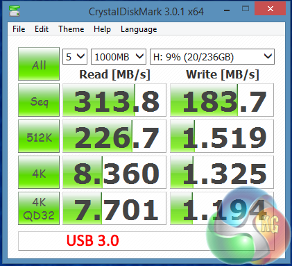 Performance from the USB 3.0 connectors are certainly not in question – we recorded a sequential read speed of 313 MB/s which is pretty much as fast as you will see.