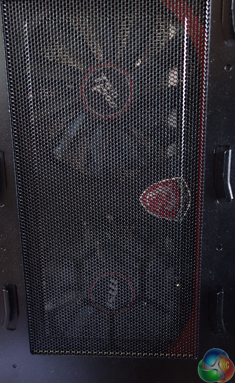 Above, with the fan filter removed we can see the MSI R9 290X graphics card, This is installed horizontally and sucks in cool air from outside the chassis. The LAN handle at the front lifts the case upwards, allowing a good intake of air for the graphics card.