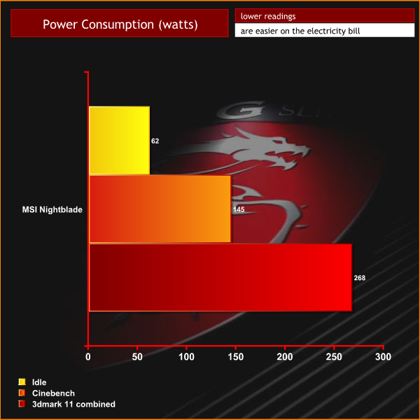 When idle, the system consumes around 60 watts of power. When the 4770k is loaded, this rises to 145 watts. When the final ‘combined' test in 3DMark 11 is triggered, this rises to around 270 watts.