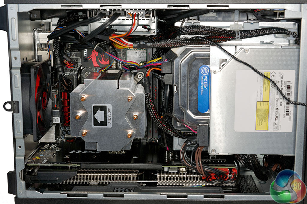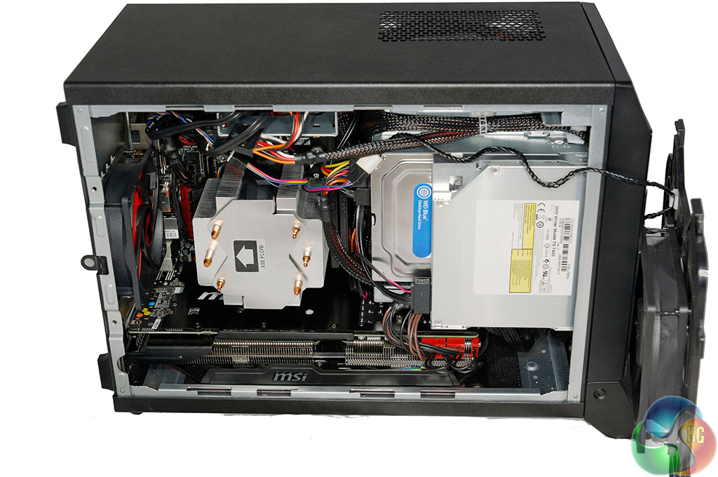 Both the DVD drive and 3.5 inch mechanical drives are installed in place vertically from the side. The MSI Z87I Gaming AC Mini ITX motherboard is fitted with the optional MSI custom CPU cooler. This board supports full sized memory up to speeds of 3,000mhz, so no need to rely on slower SO-DIMMS.