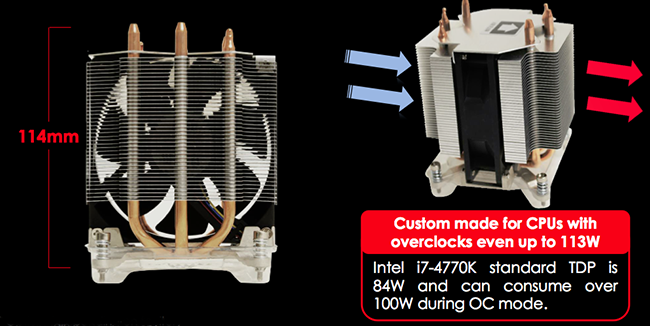 This cooler is a custom design, specifically for this chassis. It measures 114mm – the limit of the height available in this case with the R9 290X cooling panel fitted. It is designed around 3 vertical copper heatpipes and the internally mounted fan can spin up to 3,800 rpm.