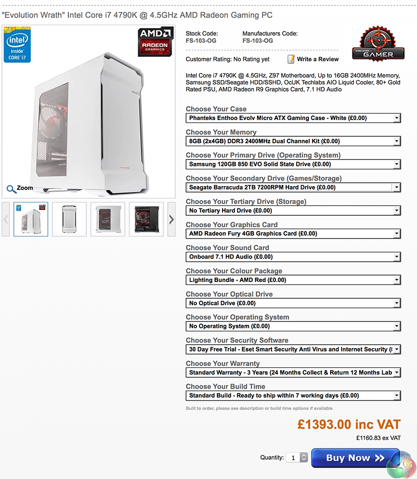 Don't have time to build your own PC? Want a nice compact, good looking system featuring one of the latest AMD Fury graphics cards? The OCUK ‘Evolution Wrath' System might just tickle the taste buds. This system features an Intel Core i7 4790K @ 4.5GHz, Z97 Motherboard, Up to 16GB 2400MHz Memory, Samsung SSD/Seagate HDD/SSHD, OcUK Techlabs AIO Liquid Cooler and an 80+ Gold Rated power supply.