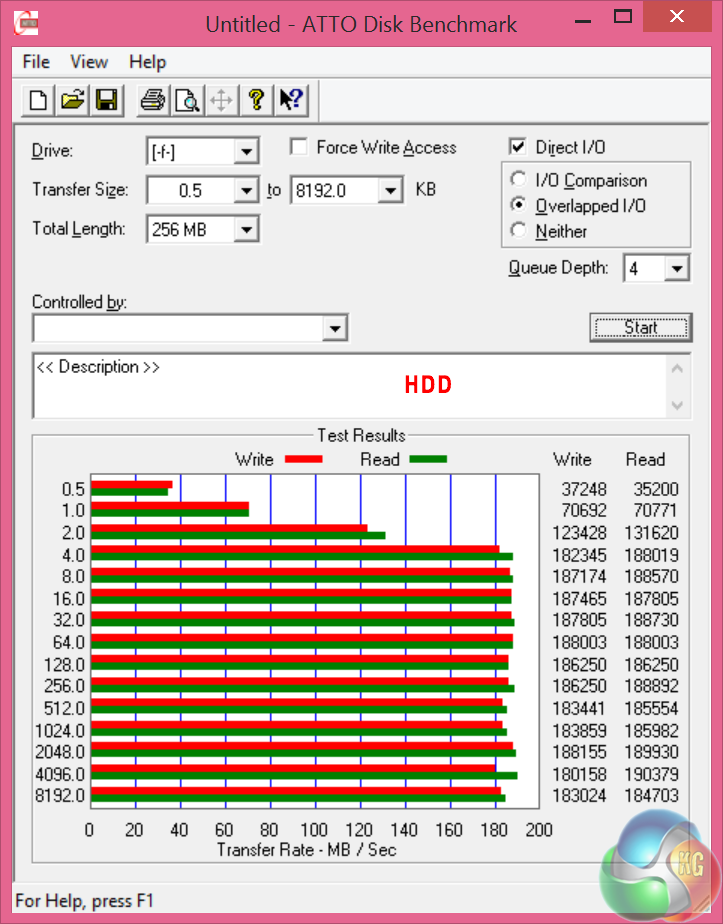 ATTO indicates much better performance from the mechanical hard drive, peaking at around 190 MB/s in both read and write tests.