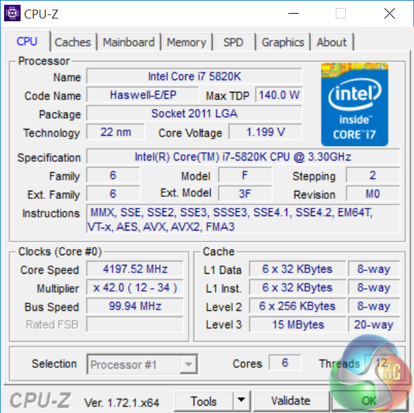 An overview of the system in CPUz and GPUz. We can see the 5820k is overclocked to 4.2ghz. You can read our analysis of this processor from back in October 2014, when it launched.