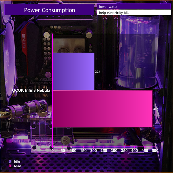 At idle, the system consumes around 200 watts, rising to around 490 watts under gaming load.
