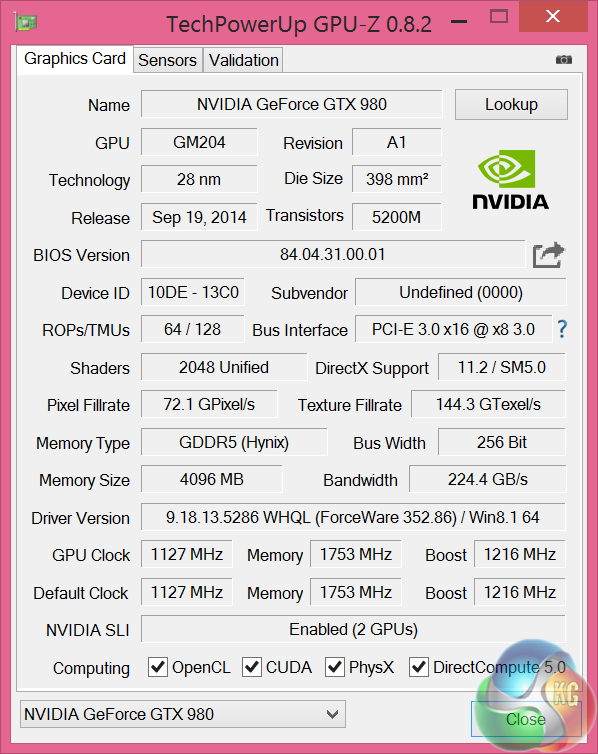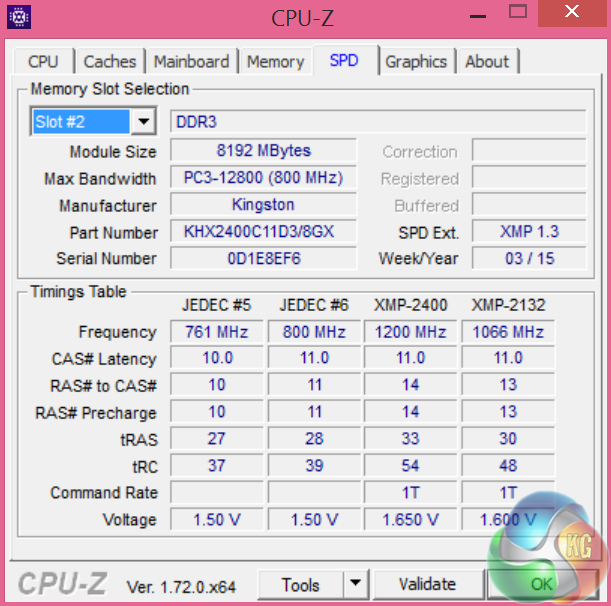 Above an overview of the system in CPUz and GPUz. We can see they are using 16GB of Kingston 2,400mhz memory – a common favourite with system builders this year. Timings are set at 12-13-14-32-2T. Graphics are supplied by two GTX980's running in SLI, at 1,127 mhz core speed.