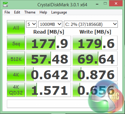 Crystalmark is a useful benchmark to measure theoretical performance levels of hard drives and SSD’s. We are using V3.0.1 x64. We test the internal 2TB mechanical hard drive.