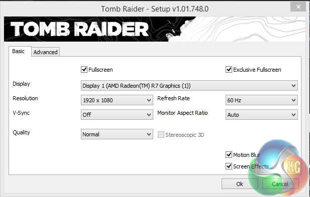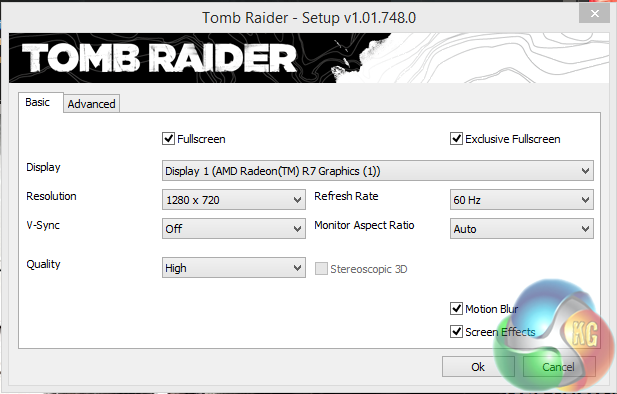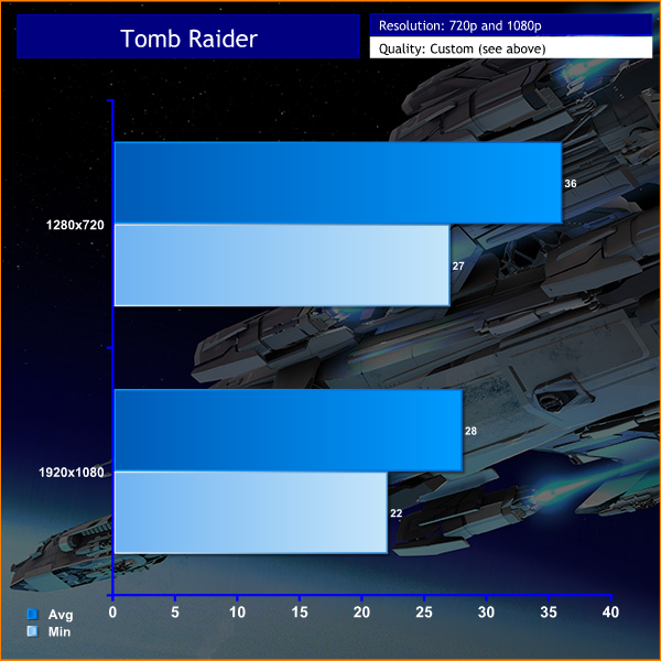 We test at both 720p and 1080p resolutions. At 1280×720 we select ‘high' quality preset. To achieve playable frame rates at 1920×1080 we dropped the image quality settings to the ‘normal' preset.