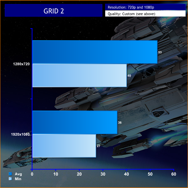 Fantastic results with GRID 2- maintaining smooth frame rates at both 720p and 1080p. Intel integrated graphics by comparison would never be able to power this engine at 1080p with the HIGH preset enabled.
