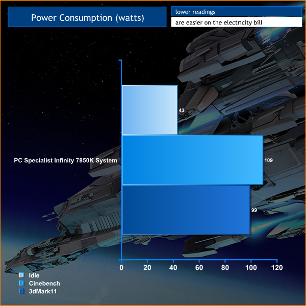 We measure the system power consumption at the wall – not factoring in the monitor. We test when idle – then when loading with Cinebench R15 and the ‘combined' test in 3Dmark11.