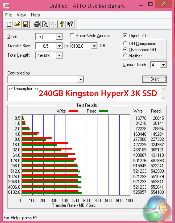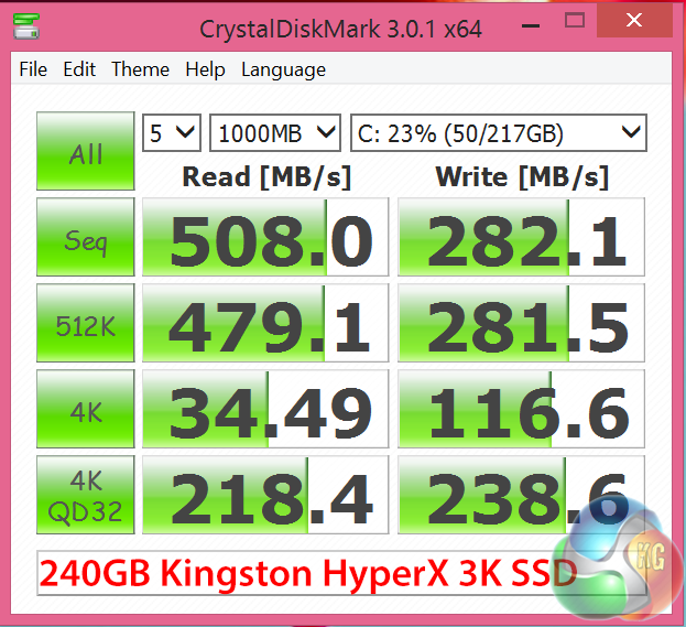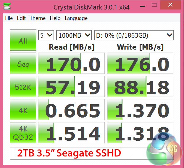 Crystalmark is a useful benchmark to measure theoretical performance levels of hard drives and SSD’s. We are using V3.0.1 x64. We test the 240GB Kingston HyperX 3K SSD, and the 2TB 3.5” Seagate SSHD