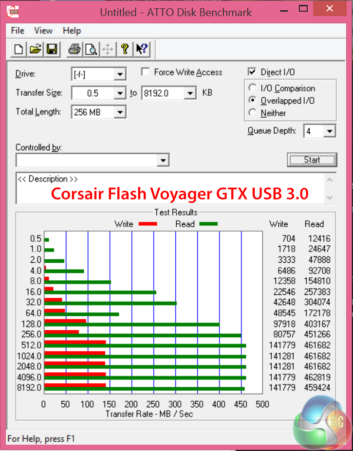 ATTO delivers results of 460 MB/s sequential read and 141MB/s sequential write. Pretty much as good as the USB 3.0 drive can deliver.