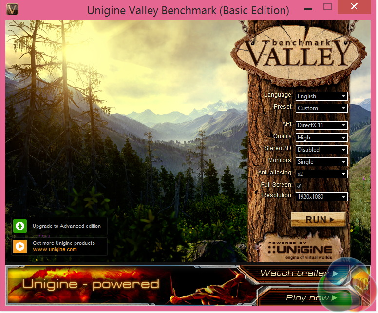 Valley Benchmark is a new GPU stress-testing tool from the developers of the very popular and highly acclaimed Heaven Benchmark. The forest-covered valley surrounded by vast mountains amazes with its scale from a bird’s-eye view and is extremely detailed down to every leaf and flower petal. This non-synthetic benchmark powered by the state-of-the art UNIGINE Engine showcases a comprehensive set of cutting-edge graphics technologies with a dynamic environment and fully interactive modes available to the end user.