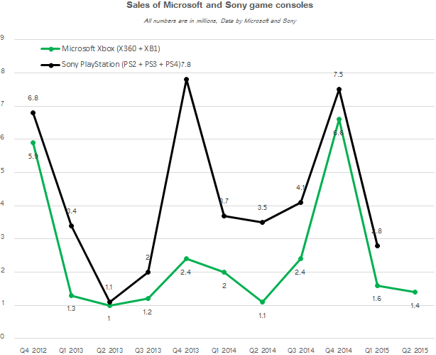In fact, Sony PlayStation 4 alone has been consistently outselling Microsoft’s Xbox One and Xbox 360 combined since the introduction of PS4. Only in Q4 2014 the Xbox platform managed to leave PS4 behind in terms of sales globally, but overall Sony sold more consoles than Microsoft during the period.