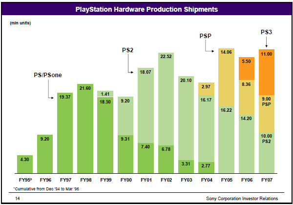 Slide taken fron Sony's FY2006 report (year ended March 31, 2007), it shows forecast data for FY2007 as well as incorrect data for PS3 sales in FY2006. Later Sony corrected the number of PS3 consoles supplied to retailers during the year to 3.61 million units.