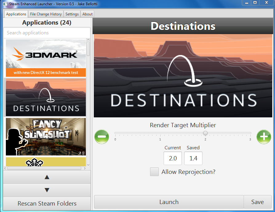 Developed by Redditor Jakebeau, the Steam Enhanced VR launcher indexes your Steam VR games, backs up modified files automatically so nothing is ever broken permanently, lets you adjust supersampling and reprojection for every app individually and has its own user interface to make it all simple.