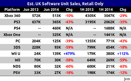 According to statistics from Gamasutra's JVM, estimations for the Wii U's software sales increased by 479 per cent year on year in June, with a total of 139,000 games sold in the UK. While this doesn't exactly top the Xbox One, which sold 325,000, or the PS4 which sold 460,000 (or in-fact, the PS3 or Xbox 360), it represents a massive uptake in Wii U software, something Nintendo desperately needed.