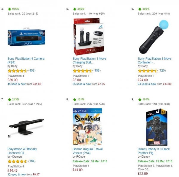 Right now on Amazon, sales of the Move controller are up by 305 percent, while sales of the PS4 camera are up 975 percent. Quite a few people are also buying the optional PS4 camera stand, which has seen sales rise by 243 percent.