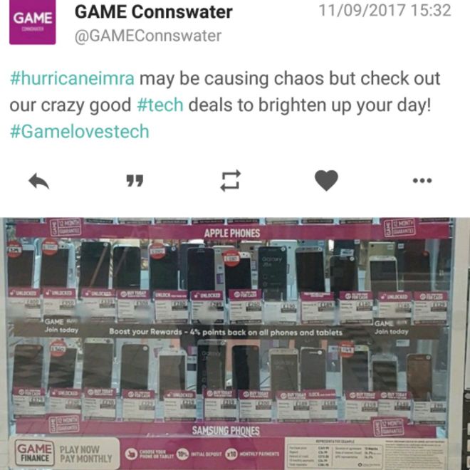 The tweet posted by GAME Connswater on Monday 11th September read “Hurricane Irma may be causing chaos but check out our crazy good tech deals to brighten up your day!”