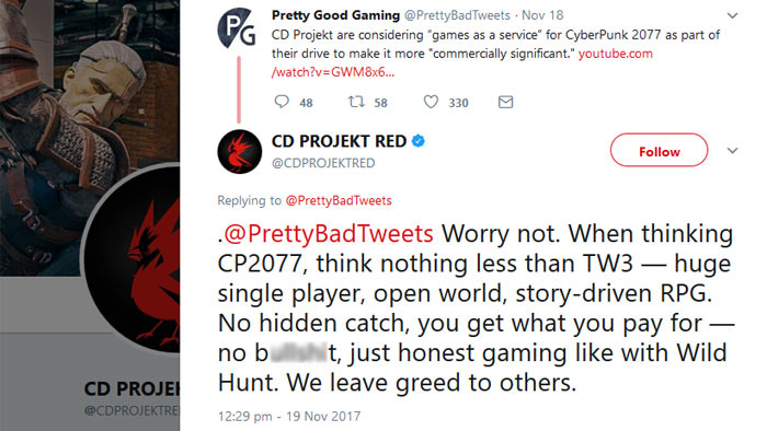Luckily, in true CD Projekt fashion, the developer has quickly quelled these fears, tweeting “Worry not. When thinking CP2077, think nothing less than TW3 – huge single player, open world, story-drive RPG. No hidden catch, you get what you pay for – no BS, just honest gaming like with Wild Hunt. We leave green to others.”