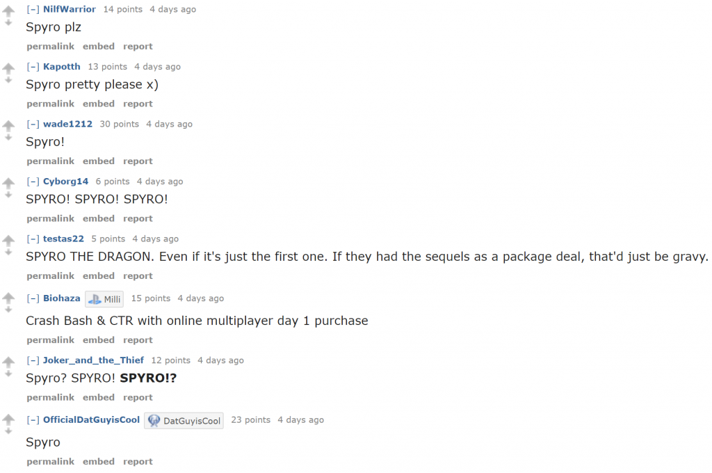 These are just a few of the comments surrounding the demand for a Spyro remake on PS4’s reddit page.