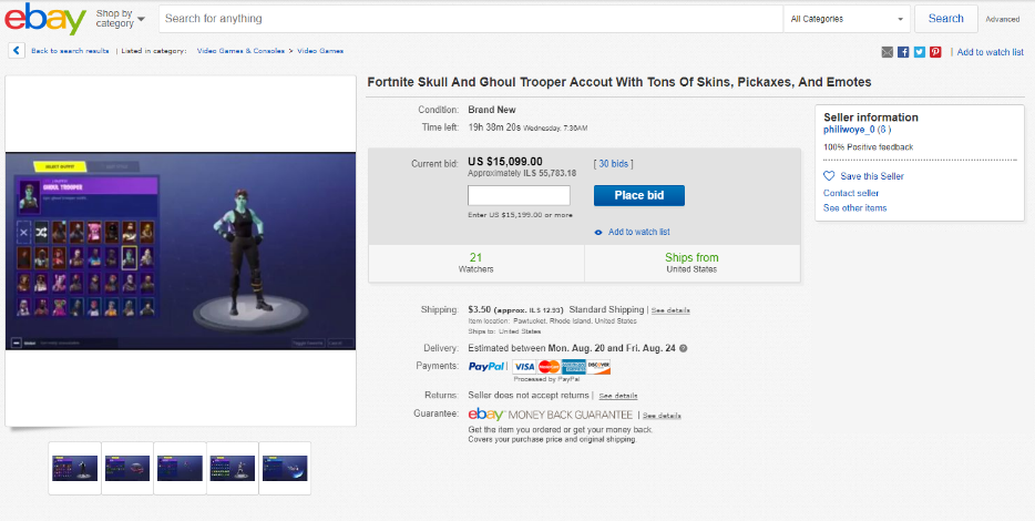 Sadly, this market has proven to be rather lucrative, with eBay seeing a collective $250,000 made from Fortnite items in just two months. The highest grossing item managed to garner over 30 bids before hitting its toal of $15,000. It isn’t just high-rollers that are targeted either, with one listing on the DDW selling an account with 55,000 V-bucks and over 50 skins for just $150.