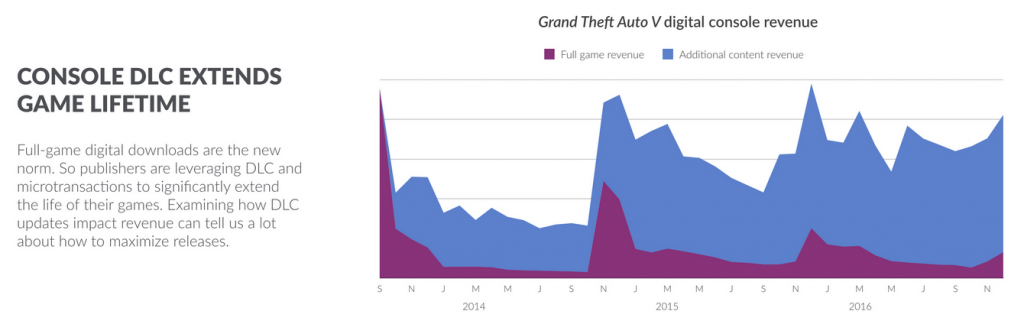 SuperData comments on the longevity of these statistics, stating that single-player titles and some multiplayer games will struggle to maintain profitable income due to the wonky implementation of microtransactions. Unfortunately, these additional sources of revenue are important in profits, as shown by the graph displaying Grand Theft Auto V’s digital console revenue alone.