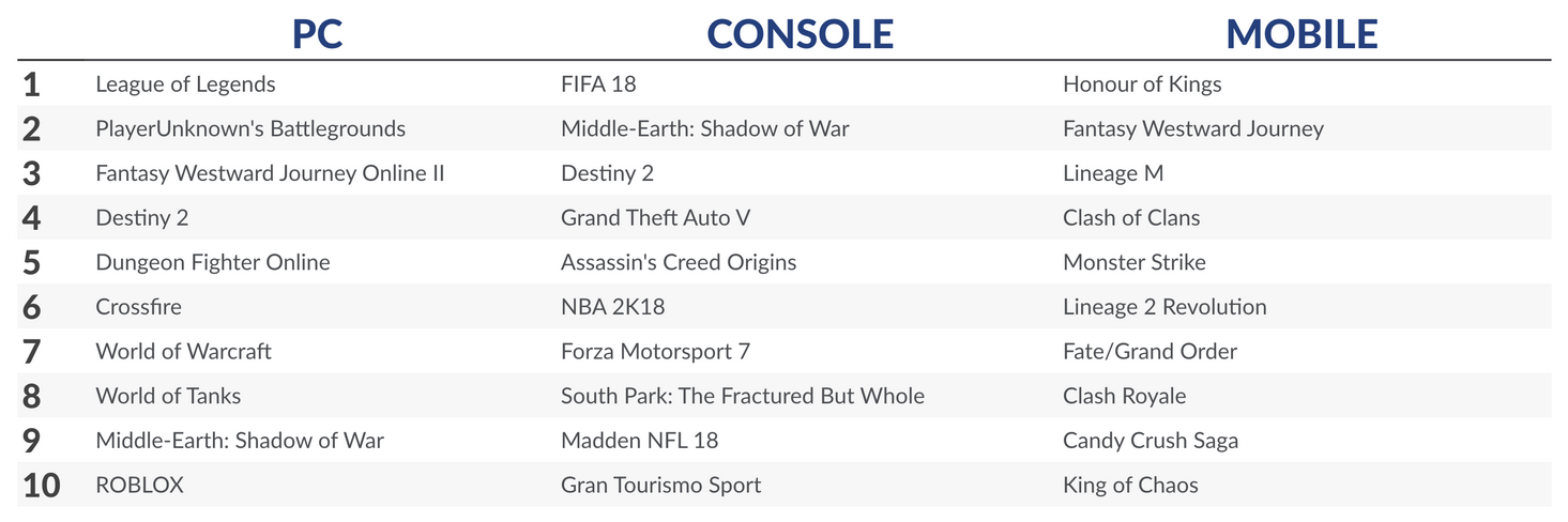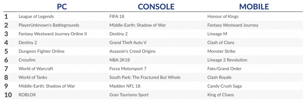 Collectively, sales on PC, consoles and mobile amounted to $8.5 billion, an increase of $1.1 billion on previous year. Given the worldwide rankings chart published by the researchers, this is credited to multiplayer games, with mainstays League of Legends topping PC sales and FIFA 18 taking the crown for consoles. Tencent’s MOBA Honor of Kings is top of the mobile chart, helping push smartphone game sales up by 19 percent in comparison to 2016.
