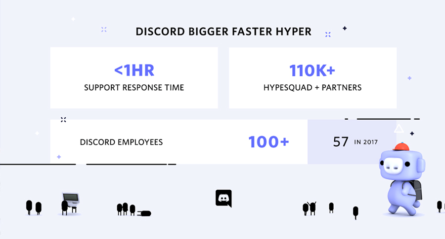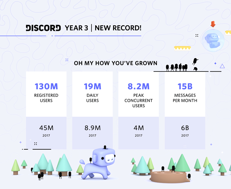The platform has seen staggering growth over the past few years, doubling almost every statistic across the board. Since its second anniversary, Discord now happily sports 130 million total registered users, 19 million daily logins and 2.5 times the messages sent since 2017 at 15 billion messages sent per month.