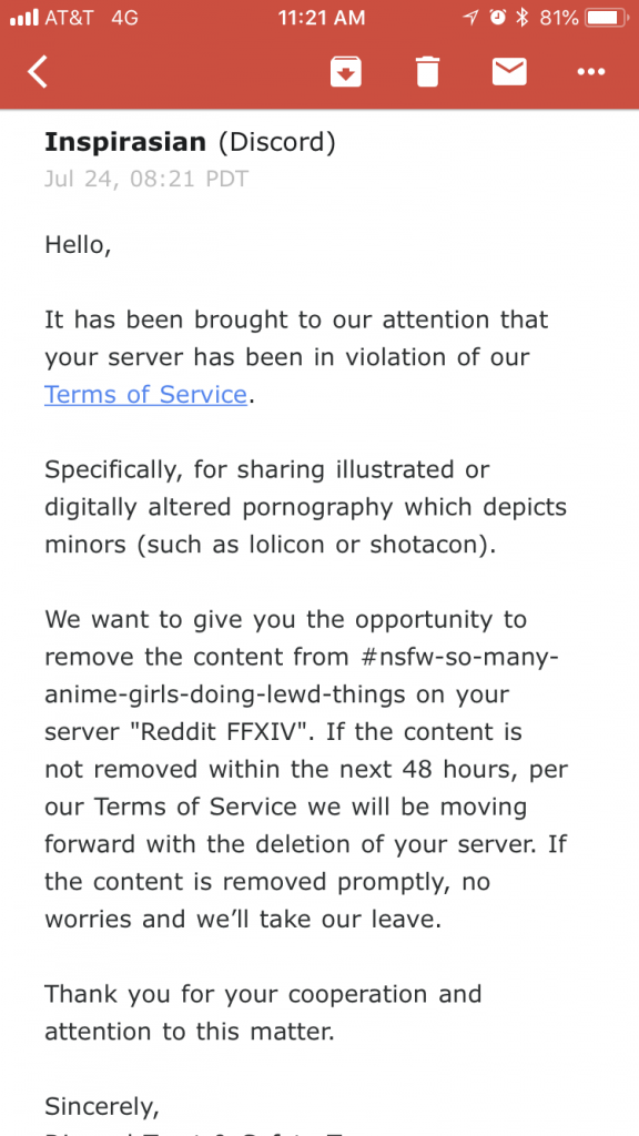 While general servers are allowed access to pornographic and less offensive content, provided that all content was posted under a channel appropriately labelled “NSFW” with the correct filter requiring user consent to proceed, the rules for partnered channels differ. As of February 2018, all partnered servers are banned from all NSFW materials, with the potential revocation of their partnered status for “consistent violation.” This is in stark contrast of the reprimand the FFXIV server has received for its first strike.