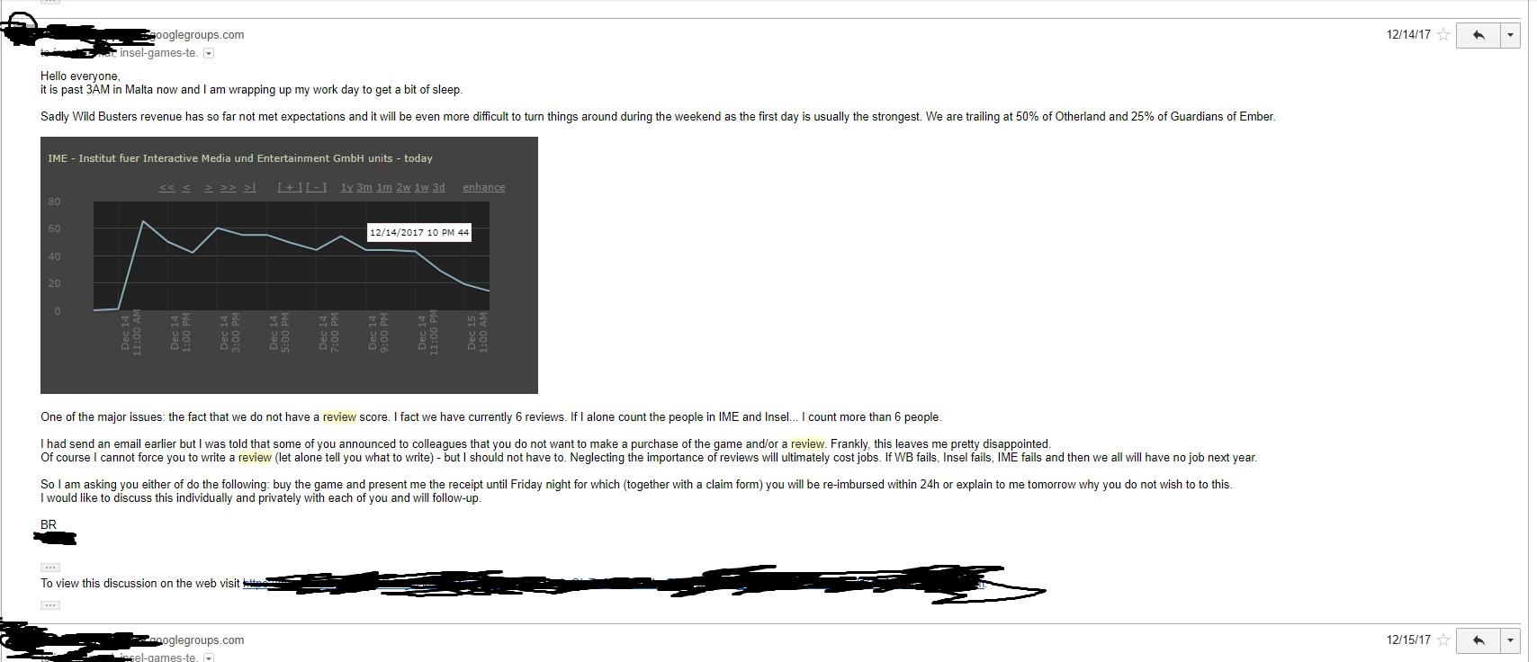 It was never intended to threaten anyone but just state the importance of reviews for the whole company. No staff has received penalties for not buying the game or writing a review. There also never were texts or instructions provided how to write the review. We sincerely apologize for the misleading wording in the email and the practice in general.