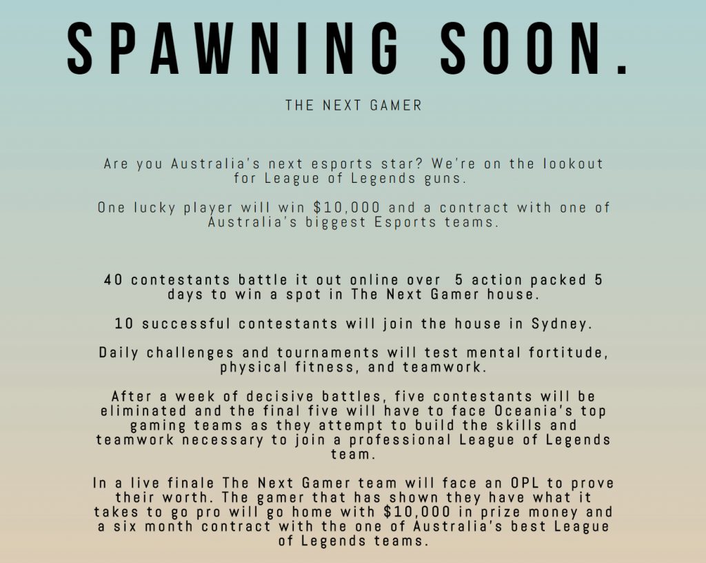 The show, called The Next Gamer, offers the chance for 10 people to enter a house in Sydney where they will battle it out for $10,000 and a six-month contract with Australia’s biggest and best eSports teams. After whittling down 40 contestants to 10, the remaining players will be put through daily challenges to “test mental fortitude, physical fitness, and teamwork.”