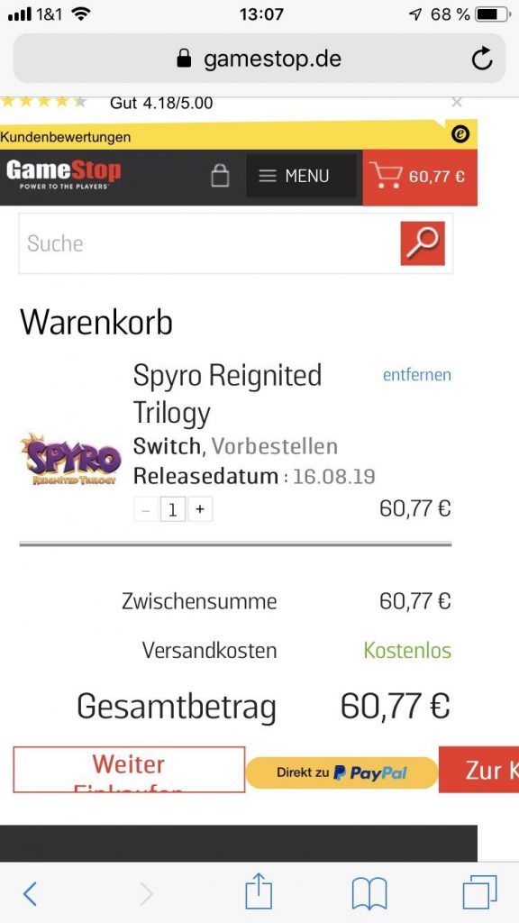 Two months later and it seems as though plans are finally moving forward. Reddit user mrculurien, caught a new listing that appeared on GameStop's German website. Capturing it before it was ultimately pulled; this indicated that a Switch version of Spyro Reignited Trilogy would be arriving on August 16th.