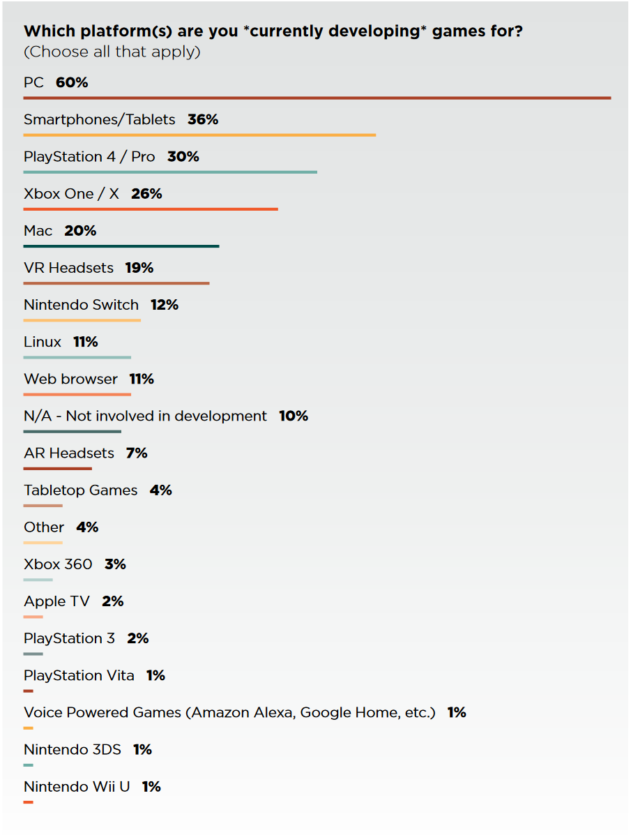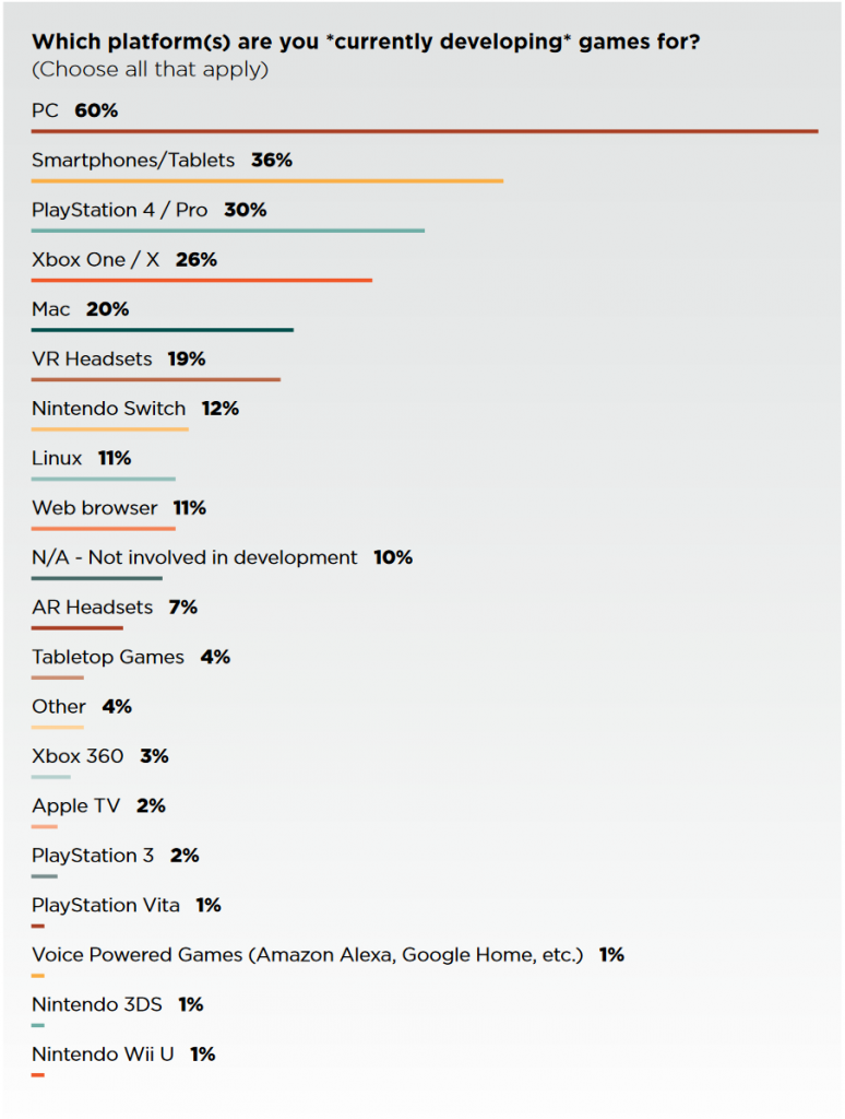 PC still dominates the scene for developers for another year, with 60 percent of developers currently working on a game for the platform. This is considerable growth from 2017, in which 50 percent of people had PC in mind for their titles. Concerning developers’ next titles, PC is keeping strong as a platform of choice to 58 percent.