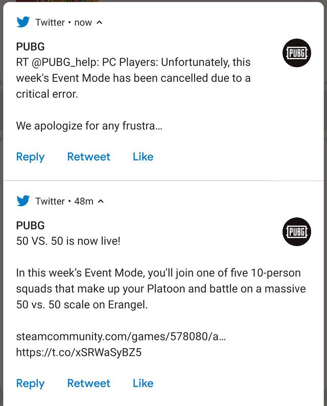 PUBG Help, publisher Bluehole’s official Twitter support channel for the game, announced that Event Mode would be taking a momentary hiatus in order for the team to fix major bugs that have consistently been causing issues for players. This has caused a delay to the return of Platoon, PUBG’s brand new 50 versus 50 mode comprised of 10-person squads, that will now “return at a later date.”