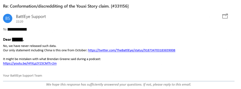 As I originally expected, the information reported by Youxi Story might have been a little blown out of proportion, as the only details released by BattlEye pertaining to the scale of cheaters coming from China specifically has been this Tweet. Instead, the anti-cheat maker suggests that the percentage might have been confused with something said by PlayerUnknown himself in this podcast.