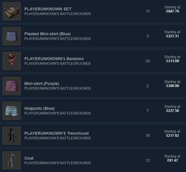 Despite its controversy, many players have welcomed the items with open arms, with some items ranging into the hundreds on the Steam Market. PlayerUnknown’s items have been worth a lot since launch, with his Bandana sitting at £313.69 and Trenchcoat at £217.62. In a surprising turn of events, a pleated purple mini-skirt has managed to reach over £320, beating PlayerUnknown’s Bandana in asking price. It’s worth noting that these are actually the lowest price available for each item, as shocking as that may seem.