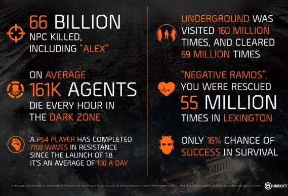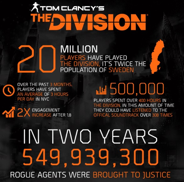 The Division seems to be treading the same path, as Ubisoft reports that 500,000 players have spent more than 400 hours in the game, killing a total of 549,939,300 enemies (rogue agents) in the process. A lot of this activity has come as a result of Update 1.8, which launched for free early in December last year. Since then, players have spent double the time engaging with the title, with players spending an average of 3 hours per day in the past three months alone.